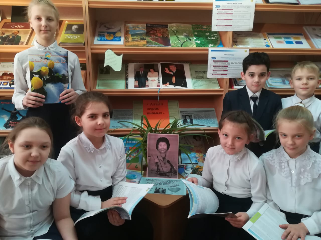 - книжная выставка «Мейірім төгетін ана» о деятельности автора программы духовно-нравственного образования «Самопознание» С.А.Назарбаевой. Библиотекарь Сагнаева С.Н. провела увлекательные и познавательные беседы для юных читателей о благотворительной деятельности С.А.Назарбаевой.