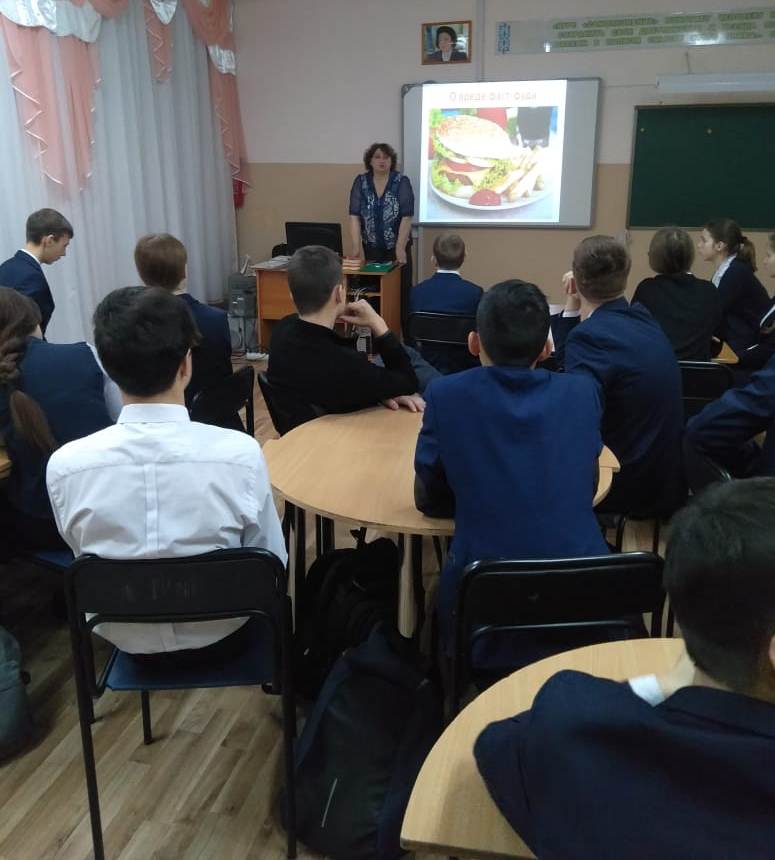 В рамках месячника по организации школьного питания под девизом «Здоровое питание – здоровье будущей нации!» в школе прошла встреча старшеклассников с медицинской сестрой кабинета ЗОЖ городской поликлиники Сейтбаталовой Е.Н., которая говорила о вреде продуктов быстрого приготовления в частности о Фаст – фудах.
