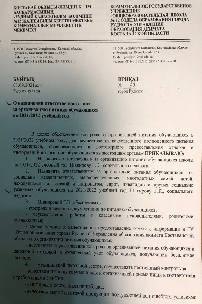 В 2021-2022 учебном году обучающиеся КГУ «Общеобразовательная школа № 12 отдела образования города Рудного» Управления образования акимата Костанайской области на 100% обеспечены горячим питанием.